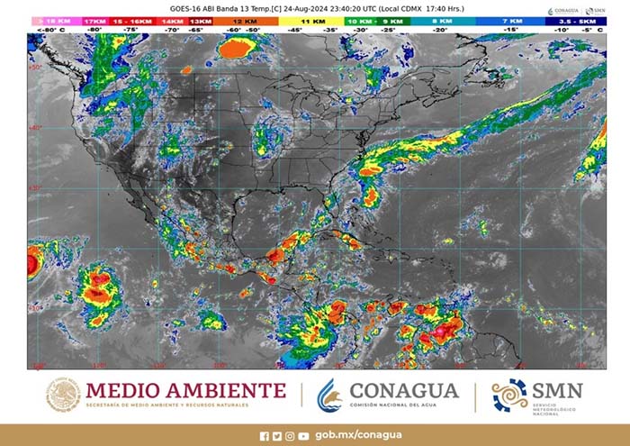 El Servicio Meteorológico Nacional (SMN) de la Comisión Nacional del Agua (Conagua) prevé para este domingo lluvias puntuales intensas en Campeche, Chiapas, Oaxaca, Tabasco y el sur de Veracruz; muy fuertes en Chihuahua, Jalisco, Nayarit, Sinaloa, Sonora y Yucatán; fuertes en Colima, Ciudad de México, Durango, Estado de México, Guerrero, Michoacán, Morelos, Puebla, Quintana Roo y Tamaulipas; chubascos (de 5 a 25 mm) en Baja California Sur, Coahuila, Guanajuato, Hidalgo, Nuevo León, Querétaro, San Luis Potosí, Tlaxcala y Zacatecas, así como lluvias aisladas (de 0.1 a 5 mm) en Aguascalientes.