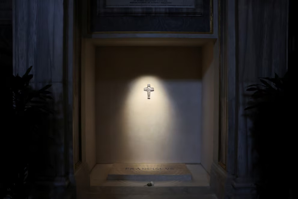 Sobre la piedra de mármol se lee apenas una palabra: “Franciscus“. Nada más. Ni títulos, ni honores, ni fechas. Encima, como una sombra protectora, cuelga una reproducción de la vieja cruz de hierro que acompañó su pontificado, símbolo visible de su anhelo de humildad, incluso frente a la eternidad. El lugar destila una sobriedad que conmueve e invita a reflexionar.