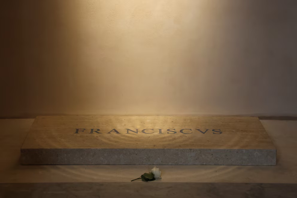 Sobre la piedra de mármol se lee apenas una palabra: “Franciscus“. Nada más. Ni títulos, ni honores, ni fechas. Encima, como una sombra protectora, cuelga una reproducción de la vieja cruz de hierro que acompañó su pontificado, símbolo visible de su anhelo de humildad, incluso frente a la eternidad. El lugar destila una sobriedad que conmueve e invita a reflexionar.