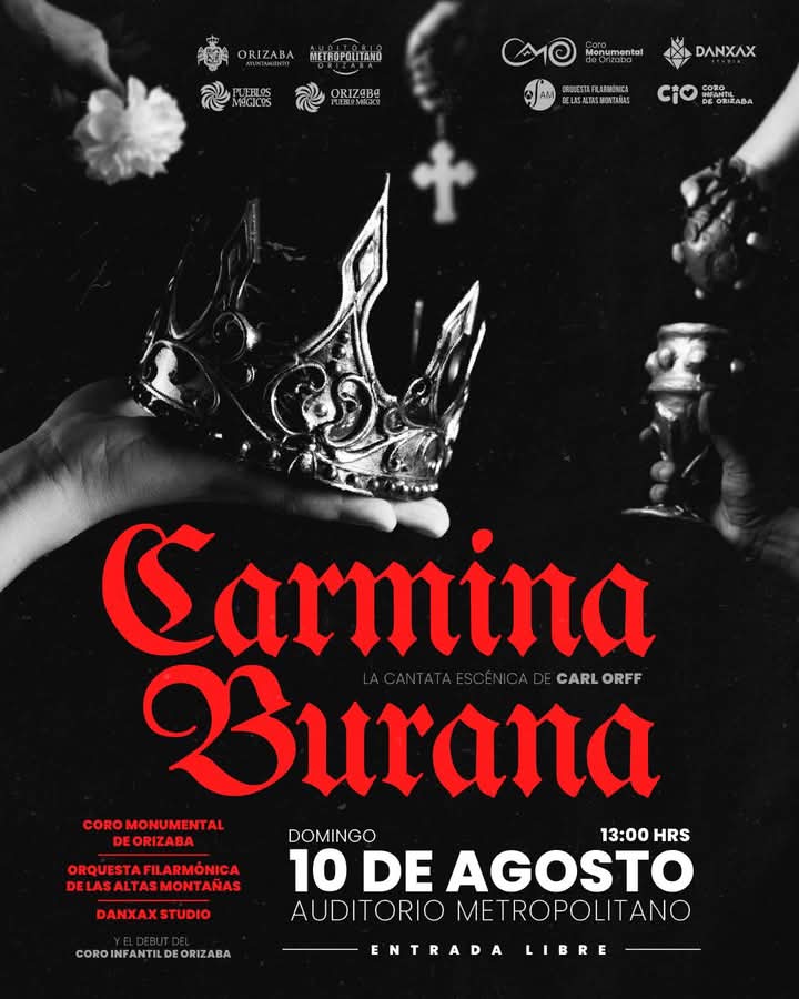 Llega al Auditorio Metropolitano de Orizaba una presentación épica: CARMINA BURANA. Una obra maestra basada en poemas medievales que hará vibrar tus sentidos, con más de 200 artistas en escena. Se presentan el Coro Monumental de Orizaba, Orquesta Filarmónica de las Altas Montañas, Compañía Danxas Studio y Coro Infantil de Orizaba.
