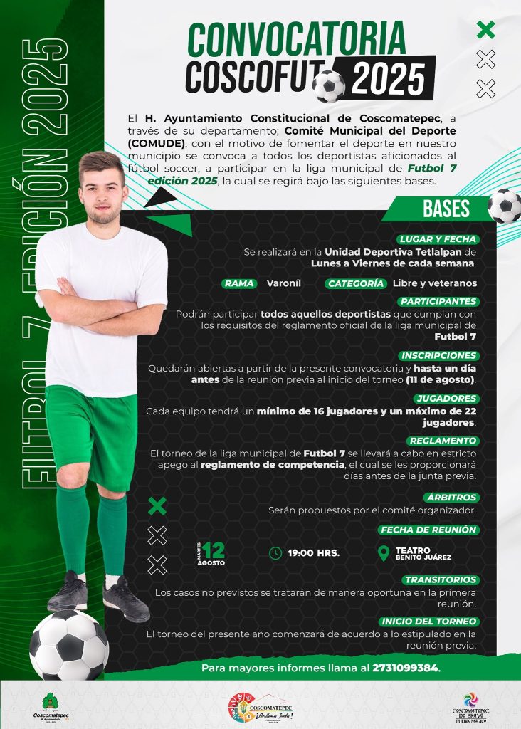 El H. Ayuntamiento de Coscomatepec, a través del Comité Municipal del Deporte (COMUDE), anunció la convocatoria para todos los futbolistas aficionados a participar en la Liga Municipal de Fútbol 7, edición 2025.