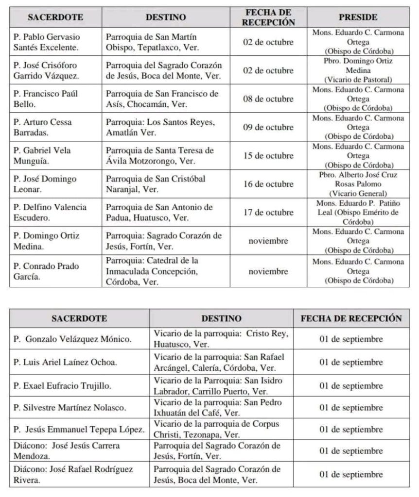 Córdoba, Ver.– La Diócesis de Córdoba, a través de su obispo Mons. Eduardo C. Carmona Ortega, dio a conocer una serie de traslados y nombramientos de sacerdotes, respondiendo a las necesidades pastorales de las diferentes parroquias de la región.