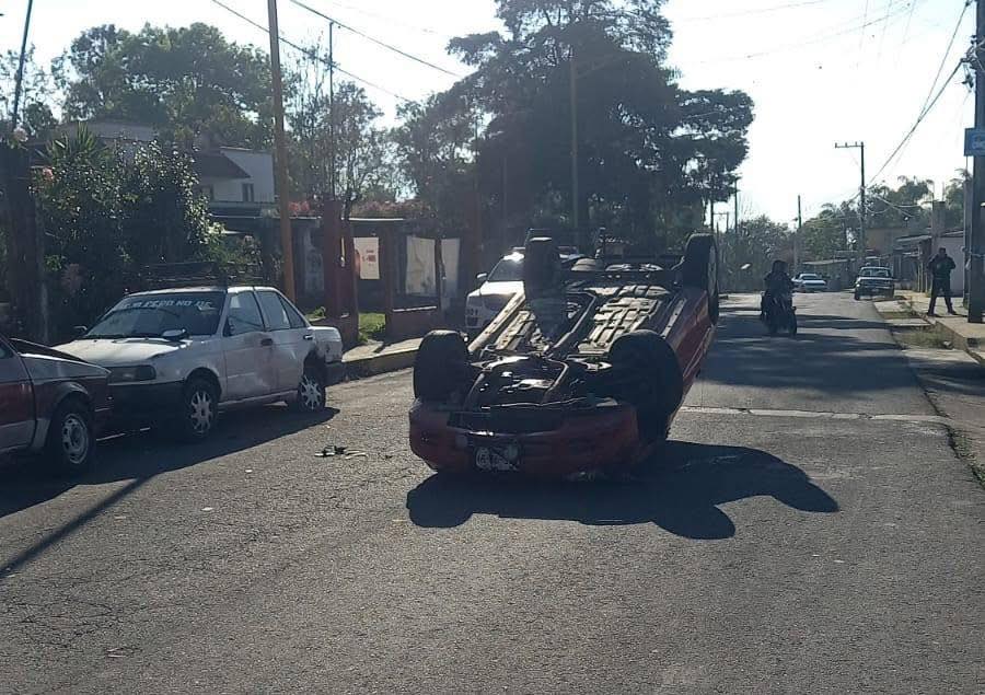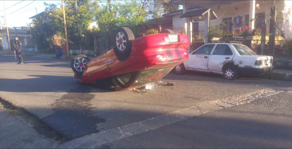 Un automóvil terminó volcado durante la madrugada de este domingo en la localidad de San José Neria, en el municipio de Chocamán.